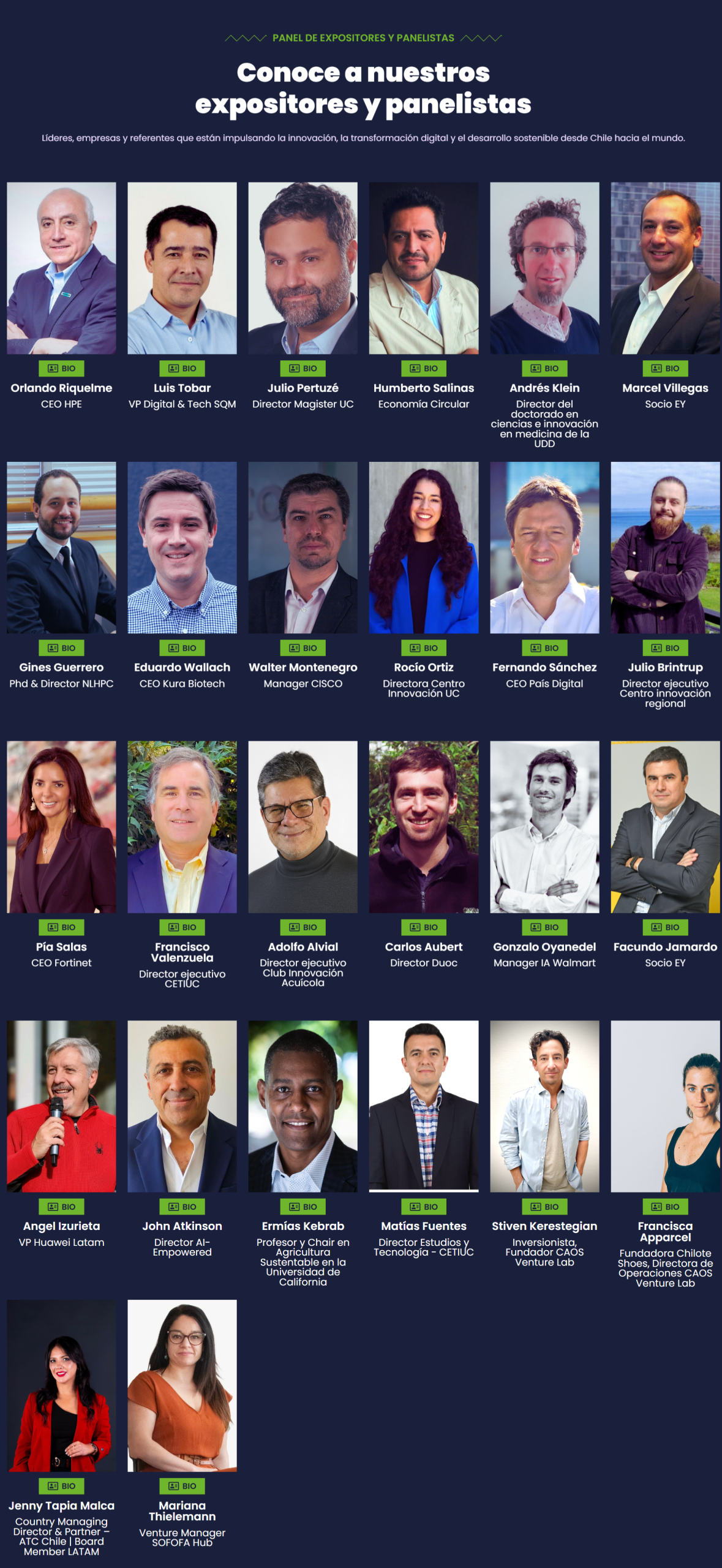 A ellos se suman John Atkinson, Walter Montenegro, Fernando Sánchez, Luis Tobar, Rocío Ortiz, Pía Salas, Mariana Thielemann, Patricia Barrientos, Eduardo Wallach, Carlos Aubert, Humberto Salinas, Ángel Izurieta, Marcel Villegas y Julio Pertuzé, quienes abordarán distintas dimensiones de la innovación, la tecnología y el desarrollo productivo.